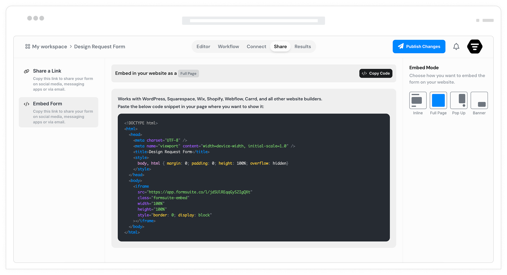 Host a full page form on your own domain with an HTML snippet. Skip the Formsuite shareable link and serve forms directly from your website. Complete control over the hosting experience.