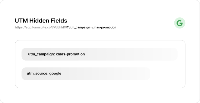 Add UTM hidden fields and they automatically capture values from the URL. No configuration needed. When someone arrives from utm_source=google, that value is stored with their submission automatically.