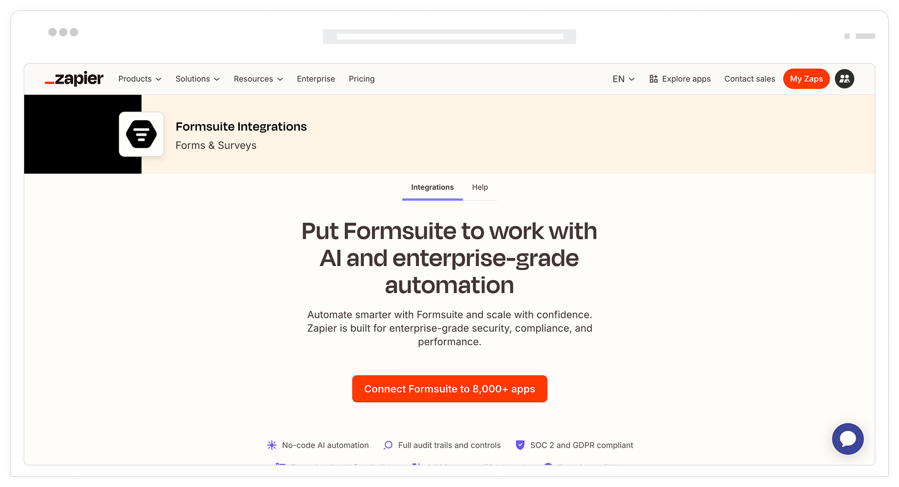All Formsuite integrations run through Zapier, giving you access to thousands of apps with no code required.