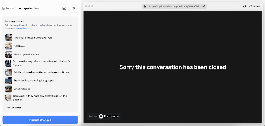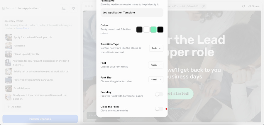 With that open, you can see the “Close the Form” section. From here you can toggle this setting on and off. When toggled on, instead of showing your form to new users, it'll show a “Sorry, this form has been closed” message. This will prevent people from being able to complete your form.