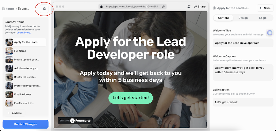 The first step is to open the form settings by clicking on the gear icon in the left editor sidebar. This will open a modal with all the form settings available.