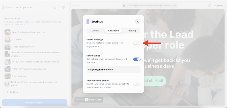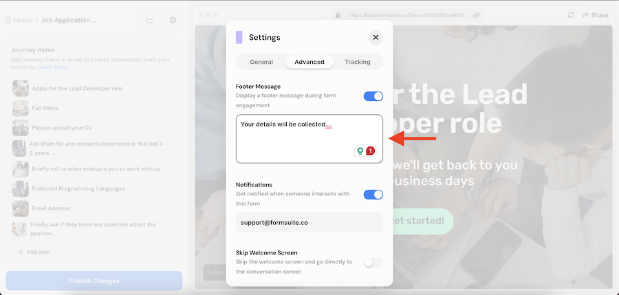 With that open, you'll want to click on the “Advanced” tab. With that active, you'll see a section called “Footer Message”. You can toggle that section on. Once you do that a text field will appear.