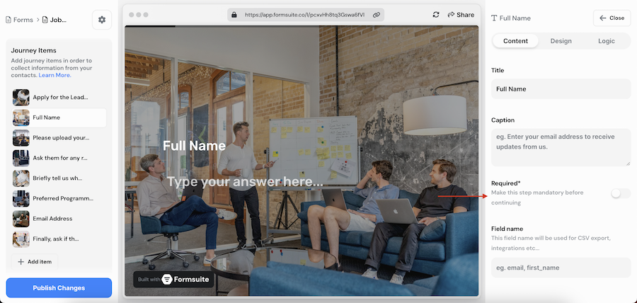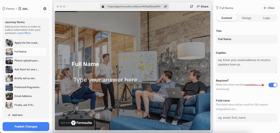 From here you can toggle the Required setting on and off. When toggled on, users cannot skip this step for the form. Click the toggle to turn on and off this setting.